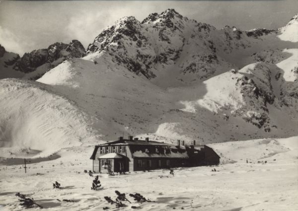 Tatry Wysokie - Schronisko Kieżmarskie w Dolinie Białych Stawów. Z lewej w tyle Baranie Rogi, pośrodku Kozi Wierch. Tytuł również w języku: ros., niem., ang.