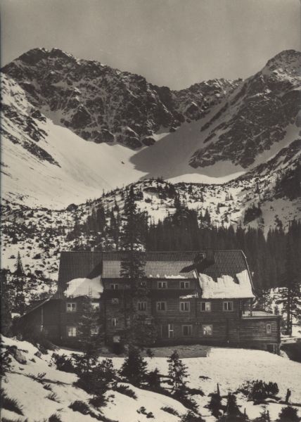 Schronisko Tatliaka pod Rohaczami zimą. W tle Ostry Rohacz.
