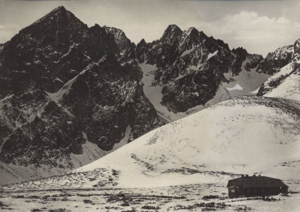 Tatry Wysokie - Schronisko Kieżmarskie Państwowe Centrum Wychowania Fizycznego, Kieżmarski Szczyt, Łomnica, Durny Szczyt. [Bł±d w opisie. Na zdjêciu widoczny jest Mały Kieżmarski Szczyt, a nie Kieżmarski Szczyt.]