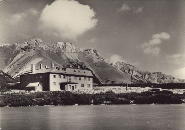 Tatry Wysokie - Schronisko Kieżmarskie (Centrum Wychowania Fizycznego SUV ČSTV) nad Wielkim Białym Stawem. W tle Tatry Bielskie: Jatki i Bujaczy Wierch.