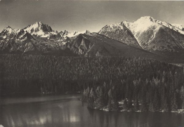 Widok na Szczyrbskie Jezioro i otaczające go lasy. W tle pokryte śniegiem wierzchołki szczytów - od lewej: Kopa Popradzka, Wysoka, Tępa i Kończysta. Z przodu Osterwa.
