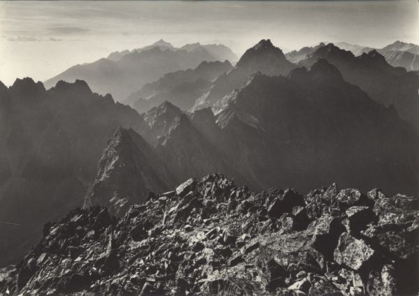 Tatry Wysokie. Widok z Gerlachu, ponad Batyżowiecki Szczyt, z lewej grań Kończystej, na horyzoncie Krywań, z prawej Wysoka i Rysy.