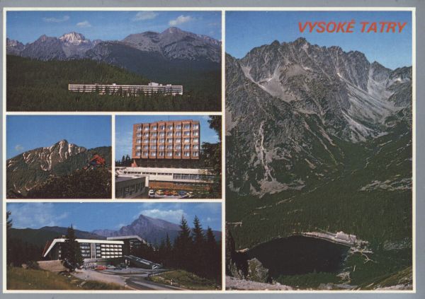 Wysokie Tatry. Sanatorium Helios w Szczyrbskim Jeziorze. Krywań - głowa Indianina. Dom wypoczynkowy RZZ Baník w Szczyrbskim Jeziorze. Dom wypoczynkowy OKD Permon w Podbańskiej. Popradzki Staw w Dolinie Mięguszowieckiej.