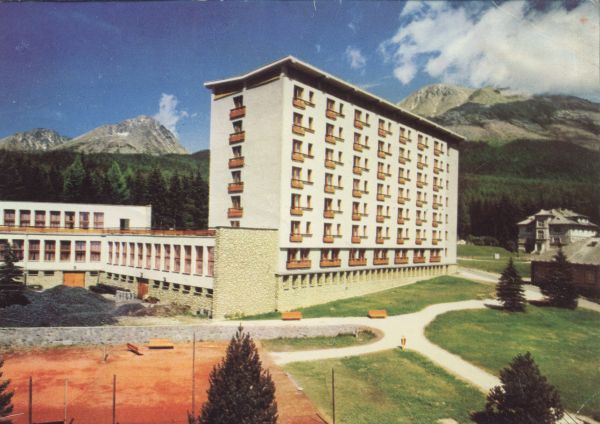 Tatry Wysokie - Tatrzańskie Zręby. Wojskowy dom wypoczynkowy, w tle Kończysta, Gerlach i Sławkowski Szczyt.