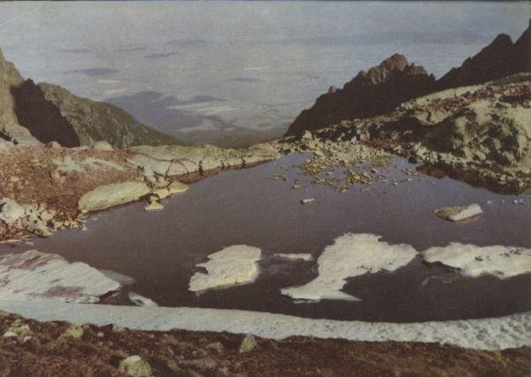 Tatry Wysokie. Dolina Małej Zimnej Wody. Widok od Małego Stawu Spiskiego do Kotliny Spiskiej. Tytuł również w języku: ros., niem., ang.