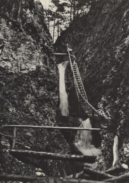 Mała Fatra. Wodospad przy Dziurach w Dolinie Wratnej. Obok wodospadu widoczna drabina i wspinający się po niej turysta.