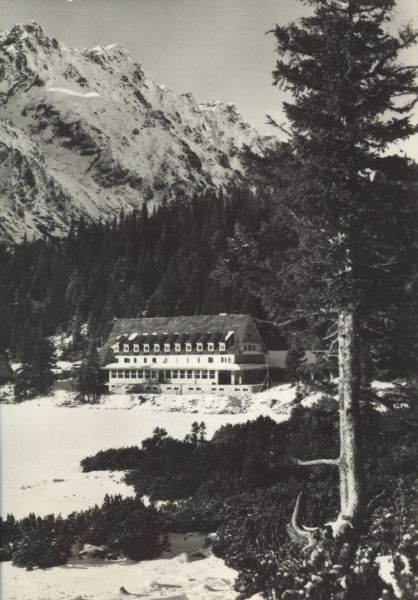 Tatry Wysokie - Hotel górski nad Popradzkim Stawem w Dolinie Mięguszowieckiej. W tle Grań Baszt z Szatanem.