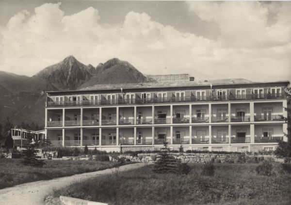 Widok na hotel Esplanade w Tatrzańskich Matlarach. W tle Łomnica i Kieżmarski Szczyt.