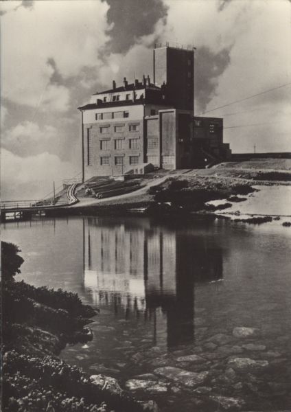 Tatry Wysokie - Stacja kolei linowej i hotel i restauracia Encián w Dolinie Łomnickiej. Widok znad Łomnickiego Stawu. Tytuł również w języku: ros., niem., ang.