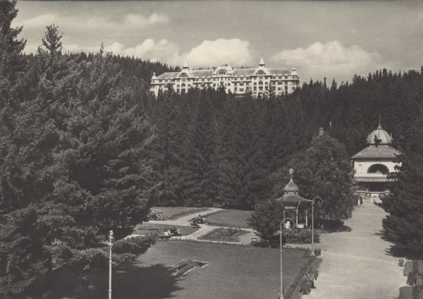 Grand Hotel Praga w Tatrzańskiej Łomnicy. Widok na park uzdrowiskowy i łaźnie.