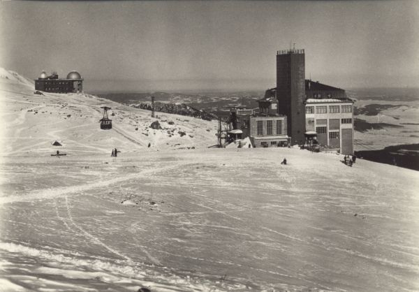 TATRANSKÝ NÁRODNÝ PARK Skalnaté pleso. Budova astronomického ústavu SAV (1780 m, vľavo) a stanica visutej lanovky s reštauráciou a hotelom "Encián" (1760 m).
