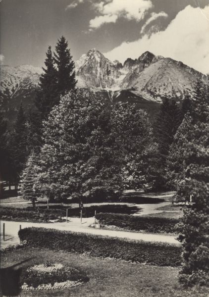 VYSOKÉ TATRY - Tatranská Lomnica Park, v pozadí Lomnickę (2634 m) a KeŸmarskę čtít (2556 m)