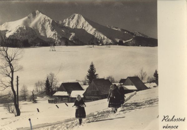 Zimowy widok na Tatry Bielskie ze Zdziaru. Na pierwszym planie 5 dziewczynek, za nimi drewniane domy i drzewa. W tle Płaczliwa Skała i Hawrań. Obok fotografii życzenia świąteczne: Radostné vánoce.