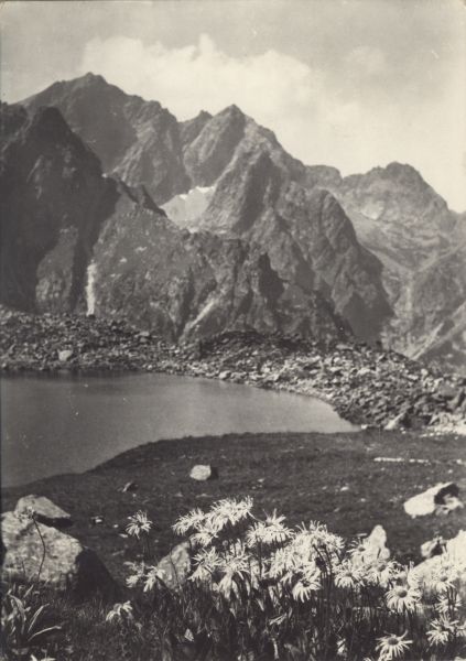 Litworowy Staw. W tle Rysy. W przodzie kwitnący omieg kozłowiec (Doronicum clusii).