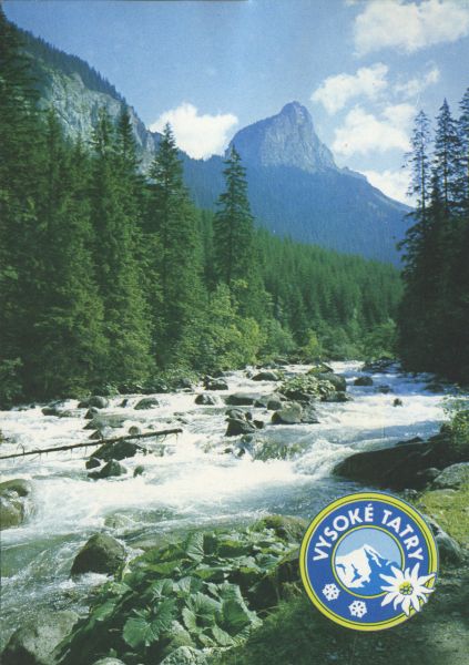 Dolina Jaworowa. W tle Murań, w dole płynie Jaworowy Potok. Na dole po prawej stronie logo miasta: VYSOKÉ TATRY.