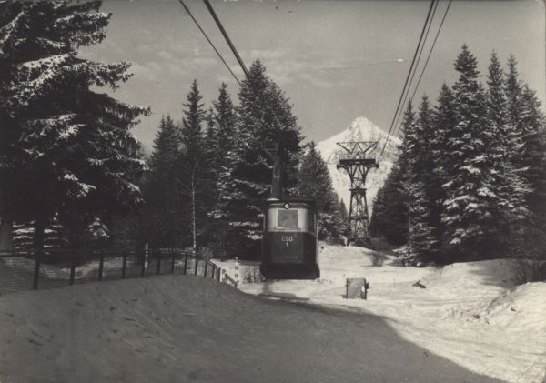 Tatrzańska Łomnica. Dolna stacja kolei linowej na Łomnicę. Wagonik kolei linowej w zimowej scenerii. W tle Łomnica.