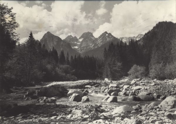 Widok z Doliny Białej Wody na Młynarz z lewej, Wysok±, Rysy, Niżnie Rysy i Niżni Żabi Szczyt. W dole płynie Biała Woda.