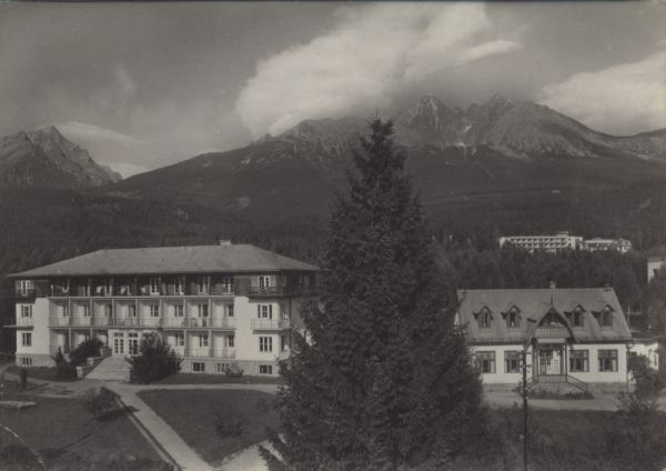 Tatry Wysokie - Tatrzańska Łomnica. Dom wypoczynkowy RZZ Wołga. W tle Sławkowski Szczyt, Łomnica i Kieżmarski Szczyt.