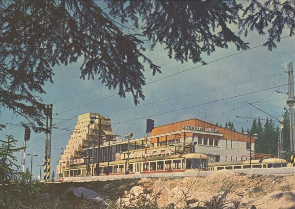 Hotel Panorama w Szczyrbskim Jeziorze. Na pierwszym planie stacja kolei elektrycznej z Popradu.