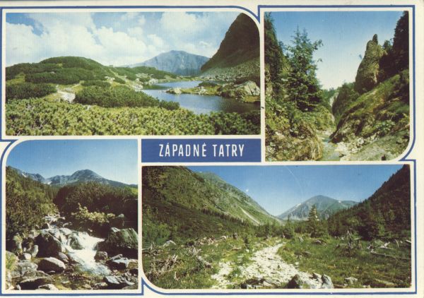 ZÁPADNÉ TATRY Horné Roháčske pleso (1718 m), v pozadí Volovec. Juráňova dolina. Žiarska dolina - pohľad od Žiarskej chaty, v pozadí Kopy. Račkova dolina - cesta na plesá, v pozadí Klín a Jakubiná.