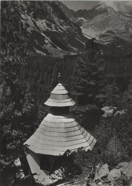 Widok na Dolinę Mięguszowiecką. Na pierwszym planie kaplica na Cmentarzu symbolicznym pod Osterwą. W tle Koprowy Szczyt.