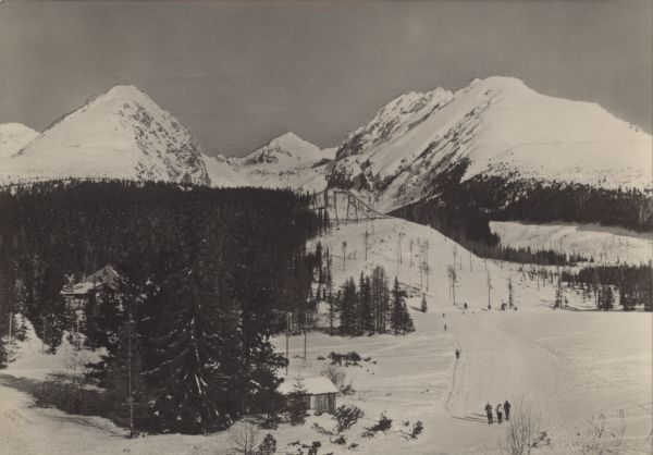 Szczyrbskie Jezioro zim±. W tle: Szczyrbskie Solisko, Szczyrbski Szczyt, Szatan i Skrajna Baszta. Na pierwszym planie narciarze, powyżej skocznia narciarska.