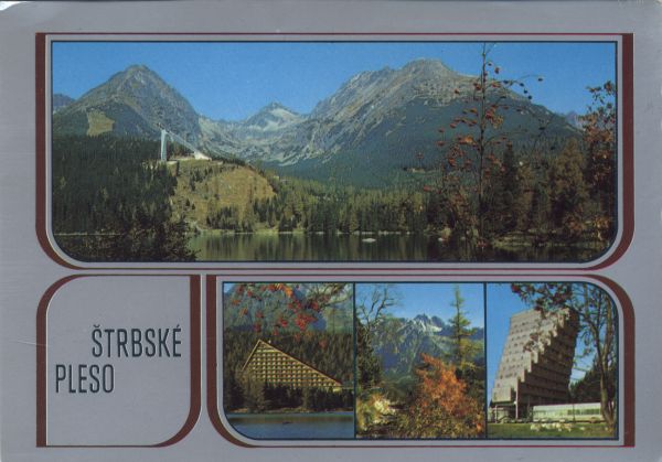 Tatranský národný park Vysoké Tatry - ©trbské Pleso (1355 m) Pohµad od ©trbského plesa na ©trbské Solisko a Patriu. Hotel Patria. Pohµad ponad Mengusovskú dolinu na dvojvrchol Vysokej (2560 m). Hotel Panoráma