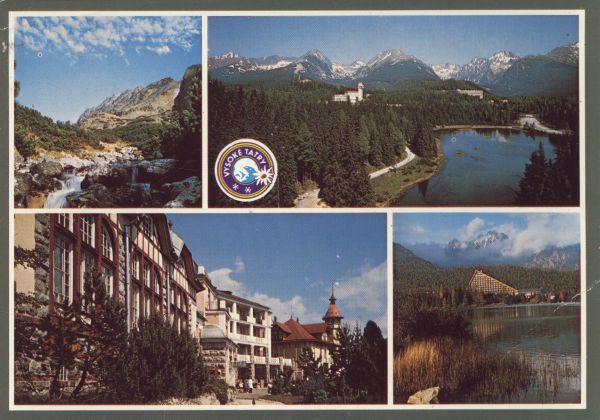 VYSOKÉ TATRY - WYSOKIE TATRY - HOHE TATRA - THE HIGH TATRAS Mlynická dolina, potok Mlynica. ©trbské Pleso, pohµad ponad Nové ©trbské pleso na panorámu Vysokých Tatier. Liečebné domy Kriváň a Hviezdoslav. ©trbské pleso, v pozadí hotel Patria.
