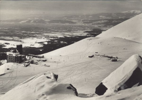 Stok narciarski w Dolinie Łomnickiej. Z lewej budynek stacji pośredniej kolei linowej na Łomnicę. W dole panorama Kotliny Tatrzańskiej.