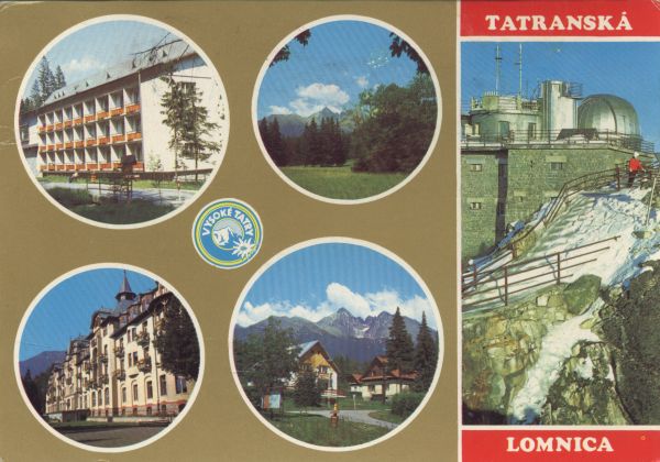 Tatranskę národnę park Vysoké Tatry - Tatranská Lomnica Zotavovòa DruŸba. Lomnickę čtít (2632 m). Grandhotel Praha. Tatranská Lomnica, v pozadí Lomnickę čtít (2632 m). Budova vrcholovej stanice visutej lanovky s pracoviskami SAV