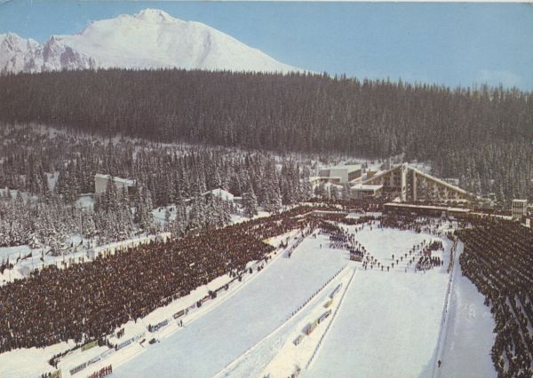 Pokazy sportowe w czasie zawodów u podnóża skoczni w Szczyrbskim Jeziorze. Na pierwszym planie kibice na trubunach.