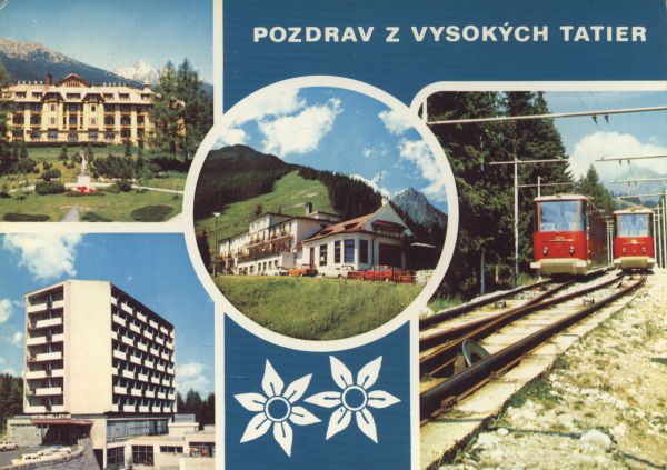 POZDRAV Z VYSOKĘCH TATIER VYSOKÉ TATRY - WYSOKIE TATRY - HOHE TATRA - THE HIGH TATRAS Grandhotel v Starom Smokovci. Hotel Bellevue v Hornom Smokovci. Zotavovòa ROH Hrebienok. Pozemná lanovka zo Starého Smokovca na Hrebienok.