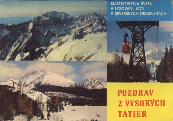Wagonik kolei linowej z Tatrzańskiej Łomnicy na Łomnicê. Na dole napis: POZDRAV Z VYSOKĘCH TATIER. U góry napis: MAJSTROSTVÁ SVETA V LYźOVANI 1970 V SEVERSKĘch DISCIPLINACH.