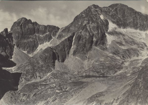 Widok z Łomnickiej Przełęczy na Dolinę Pięciu Stawów Spiskich. Od lewej: Mały Lodowy Szczyt, Lodowa Kopa i Lodowy Szczyt. W dole Schronisko Téryego z lewej którego Po¶redni Staw Spiski.