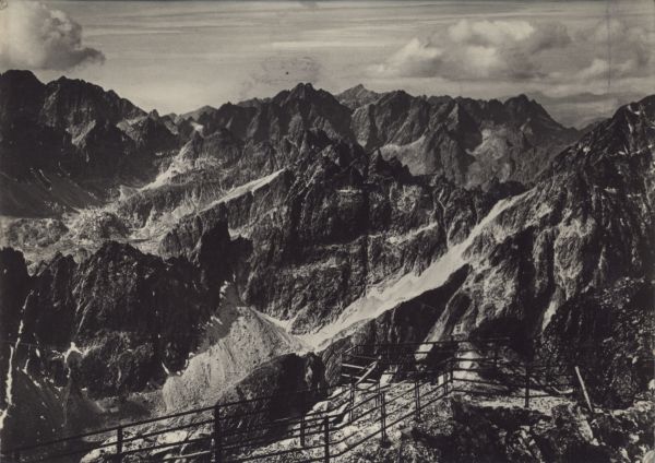Widok z Łomnicy na zachód: na horyzoncie Gerlach, Wysoka, Krywań i Rysy. Po prawej Lodowa Kopa, na wprost Mały Lodowy Szczyt nad Dolin± Małej Zimnej Wody. Na szczycie Łomnicy widoczna platforma widokowa.