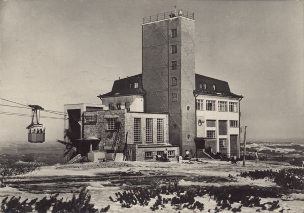 Pośrednia stacja kolei linowej na Łomnicę znajdująca się w Dolinie Łomnickiej. Hotel Encián. Z lewej wagonik kolejki. Przed budynkiem opalają się turyści.