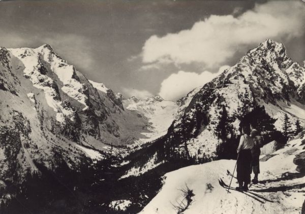 Narciarze na Łomnickiej Kazalnicy. W tle z lewej Sławkowski Szczyt, Dolina Staroleśna, Pośrednia Grań i Dolina Małej Zimnej Wody.