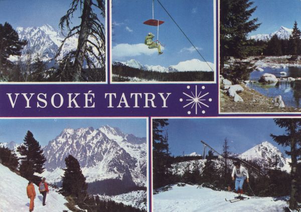 VYSOKÉ TATRY Kôpky a Vysoká (2560 m) nad Mengusovskou dolinou. Štrbské Pleso - sedačkový výtah k lyžiarskym mostíkom v Areáli snov, vľavo Vysoká, vpravo Končistá. Podbanské - Kriváň (2494 m). Kôpky a Vysoká z magistrály. Štrbské Pleso - na bežeckej dráhe, v pozadí Kriváň, lyžiarsky mostík, masív Soliska.