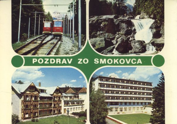 Pozdrowienia ze Smokowca. Tatry Wysokie. Kolej linowo-terenowa ze Smokowca na Siodełko. Fragment wodospadów Zimnej Wody. Branisko, Sanatorium Czechosłowackich Państwowych Uzdrowisk i Sanatorium Palace w Nowym Smokowcu.