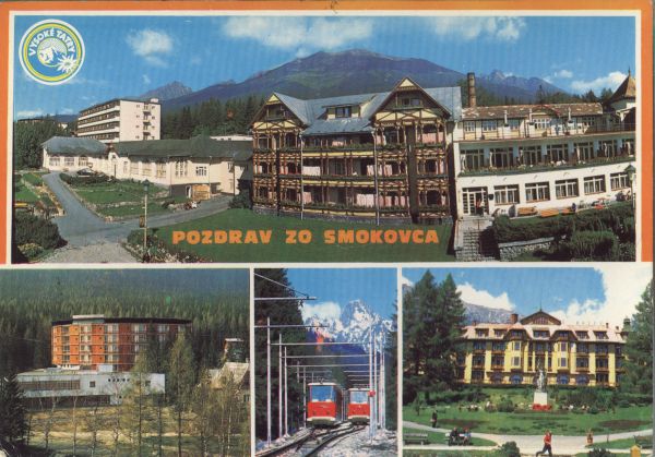 POZDRAV ZO SMOKOVCA Nový Smokovec (1000 m), liečebné domy Palace a Europa. Park hotel. Pozemná lanovka na Hrebienok. Starý Smokovec, hotel Grand.