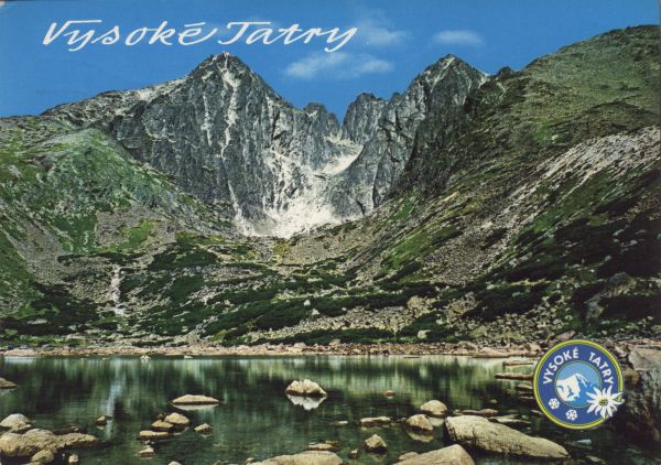 Dolina Łomnicka. Widok znad Łomnickiego Stawu na Łomnicê, Grań Wideł i Kieżmarski Szczyt. W prawym dolnym rogu logo miasta: VYSOKÉ TATRY, u góry napis Vysoké Tatry.