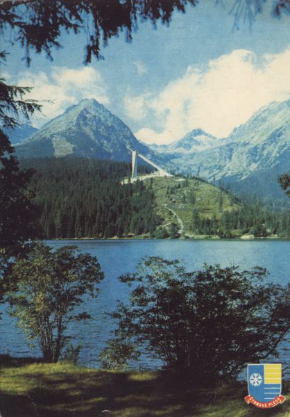 Szczyrbskie Jezioro. W tle skocznia narciarska, Szczyrbskie Solisko, Szczyrbski Szczyt. Na dole po prawej stronie herb Szczyrbskiego Jeziora.
