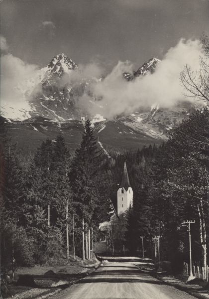 Widok z Tatrzańskiej Łomnicy. Przy ulicy ze szpalerami drzew kościół ewangelicki. W tle widoczne: Łomnica i Kieżmarski Szczyt.