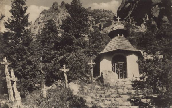 Kaplica na Cmentarzu symbolicznym pod Osterwą w Dolinie Mięguszowieckiej. Po lewej stronie drewniane krzyże, w tle drzewa i urwiska Osterwy.