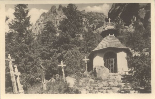 Kaplica na Cmentarzu symbolicznym pod Osterwą w Dolinie Mięguszowieckiej. Po lewej stronie drewniane krzyże, w tle drzewa i urwiska Osterwy.
