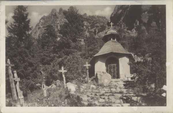 Kaplica na Cmentarzu symbolicznym pod Osterwą w Dolinie Mięguszowieckiej. Po lewej stronie drewniane krzyże, w tle drzewa i urwiska Osterwy.