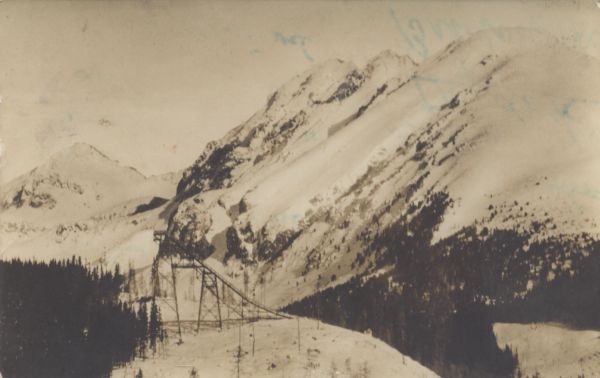 Skocznia narciarska im. Karola Jarolímka w Dolinie Młynickiej w zimowej scenerii. W tle od lewej: Szczyrbski Szczyt, Szatan i Skrajna Baszta.