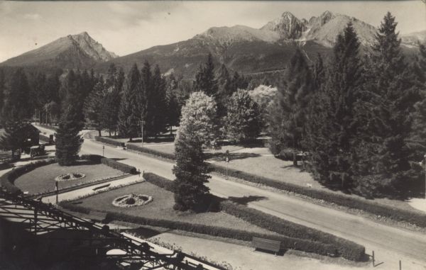 Tatrzańska Łomnica. Widok z hotelu Łomnica na Drogê Wolno¶ci i park. W tle Sławkowski Szczyt, Łomnica i Kieżmarski Szczyt.