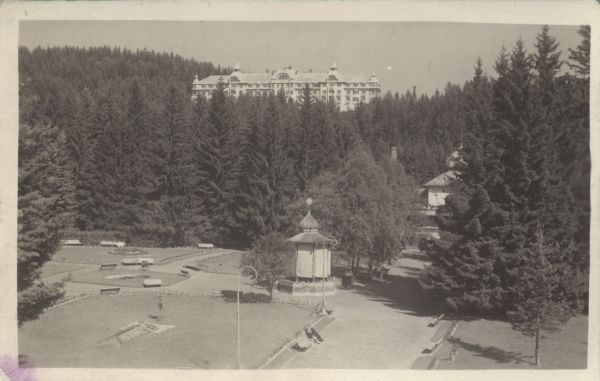 Tatrzańska Łomnica. Łazienki w parku zdrojowym, w tle Grand Hotel Praga.