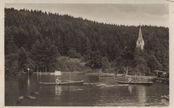 Tatrzańska Łomnica. Jeziorko, turyści w łodziach. W tle wieża kościoła ewangelickiego.
